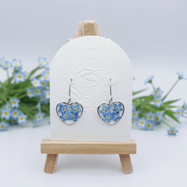 Sweet, simple, and full of meaning. Real blue forget-me-not blossoms are hand-arranged inside petite heart bezels and preserved in crystal-clear resin. Finished with silver-plated hooks, these lightweight drops add a soft pop of colour to any outfit - and each pair is uniquely yours.